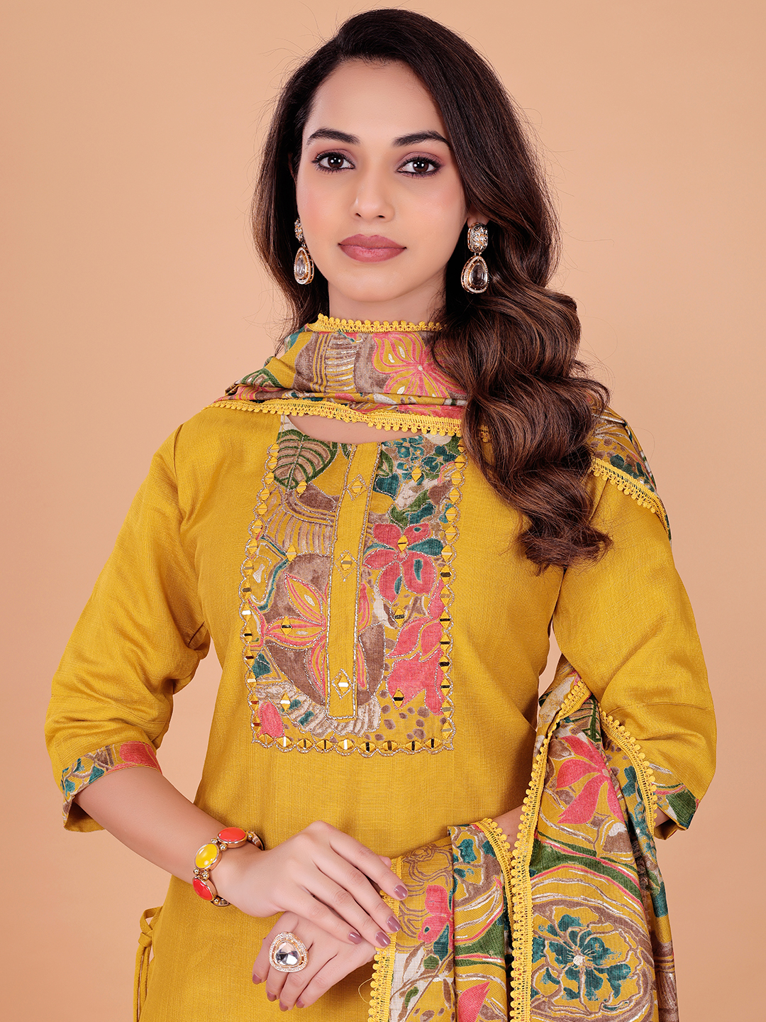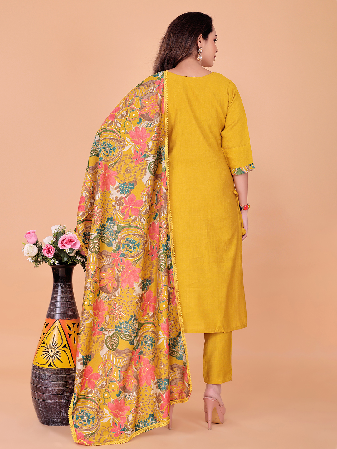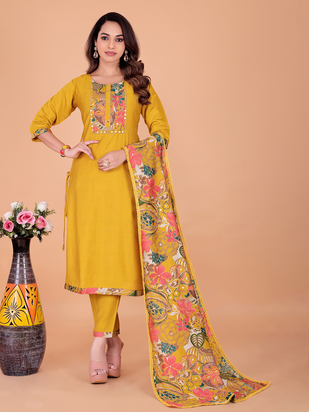 Upgrade your ethnic wardrobe with this elegant Mustard Yellow Printed Kurti Set, crafted from soft and breathable cotton fabric. The straight-fit kurta features beautiful ethnic prints on the yoke, paired with comfortable matching pants and a vibrant floral printed dupatta. Perfect for daily wear, office wear, casual outings, and festive occasions, this kurti set offers a graceful look with all-day comfort.