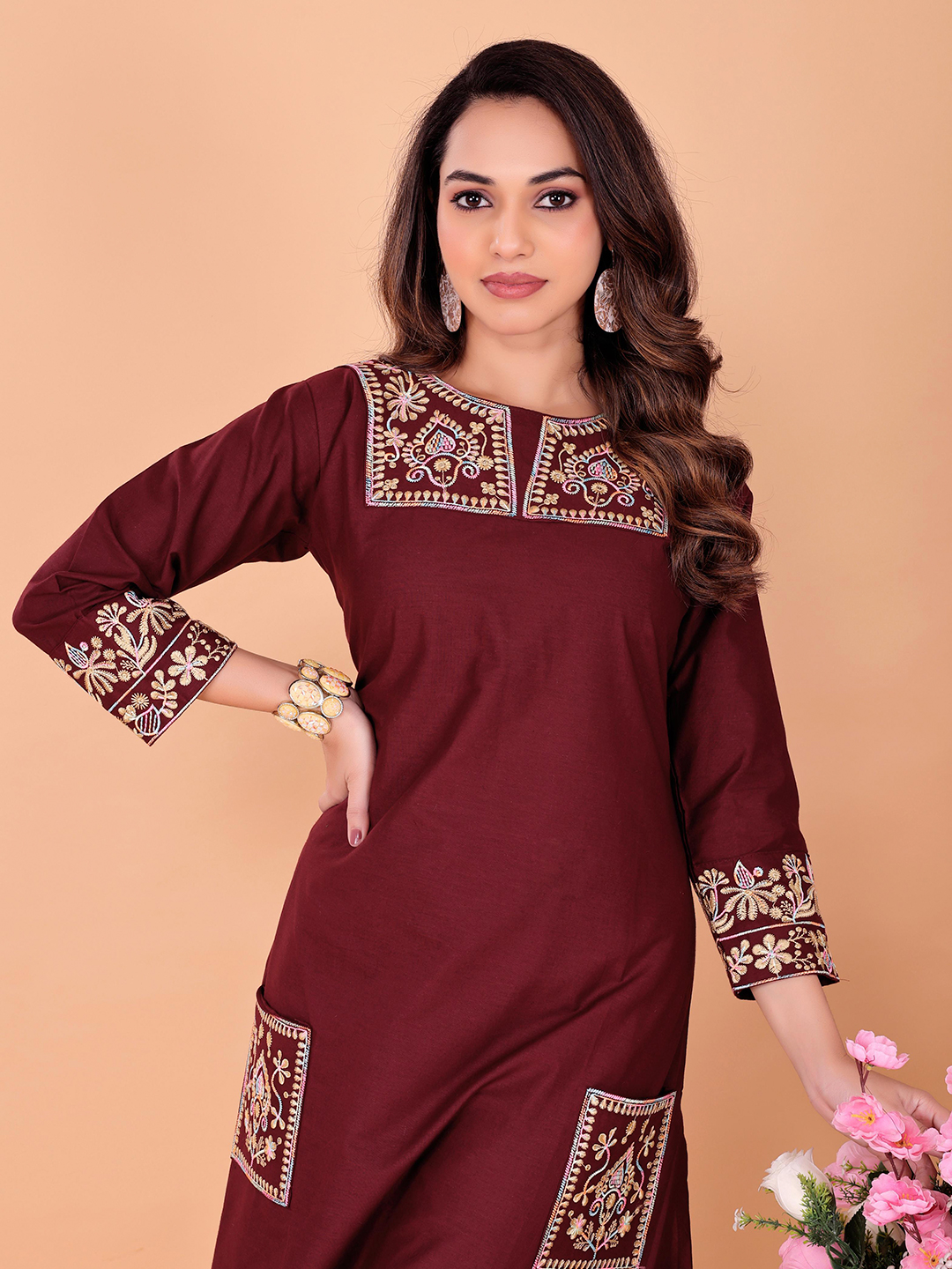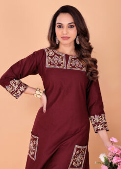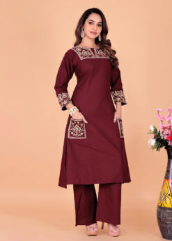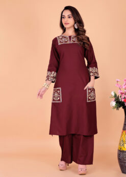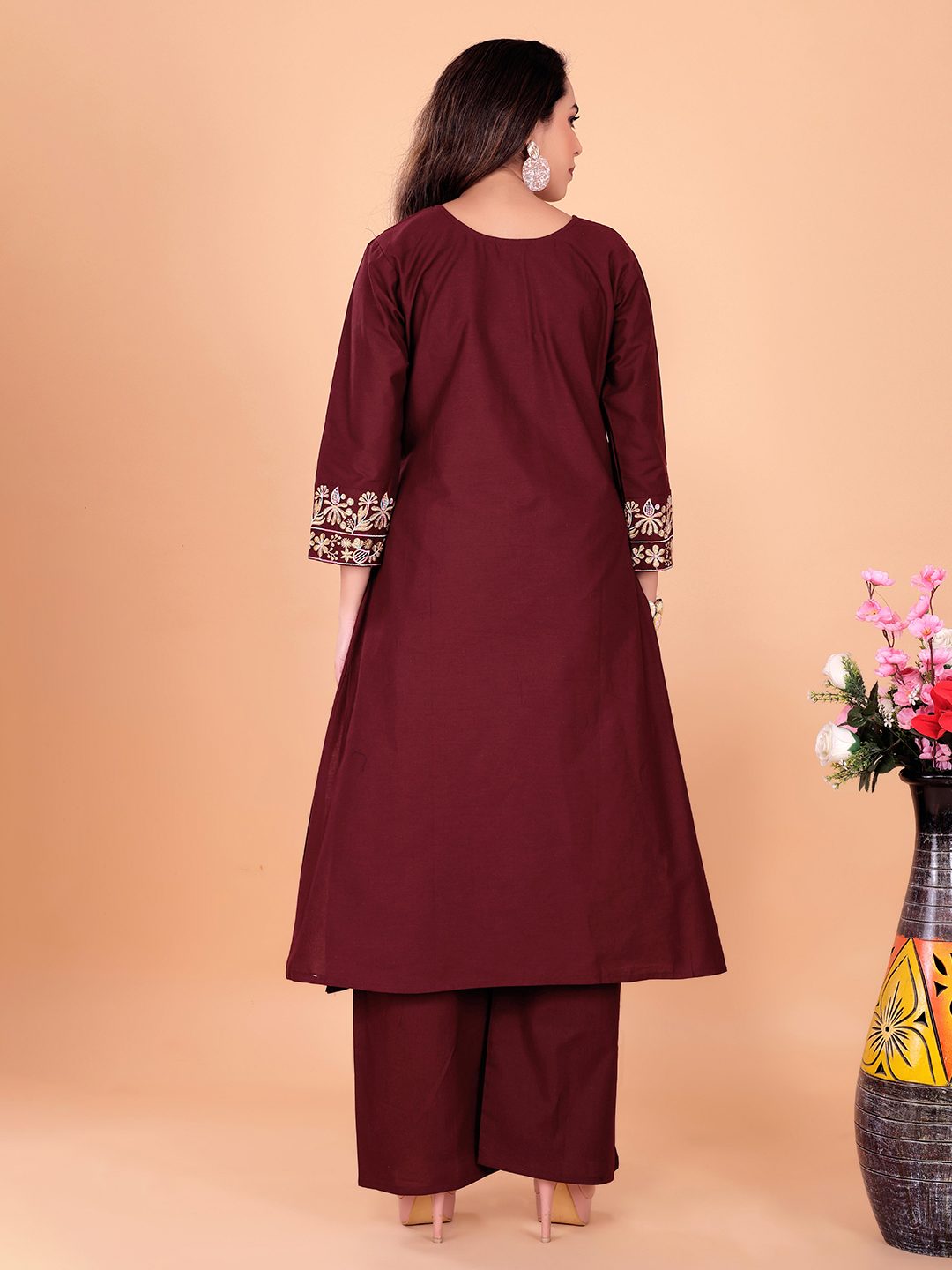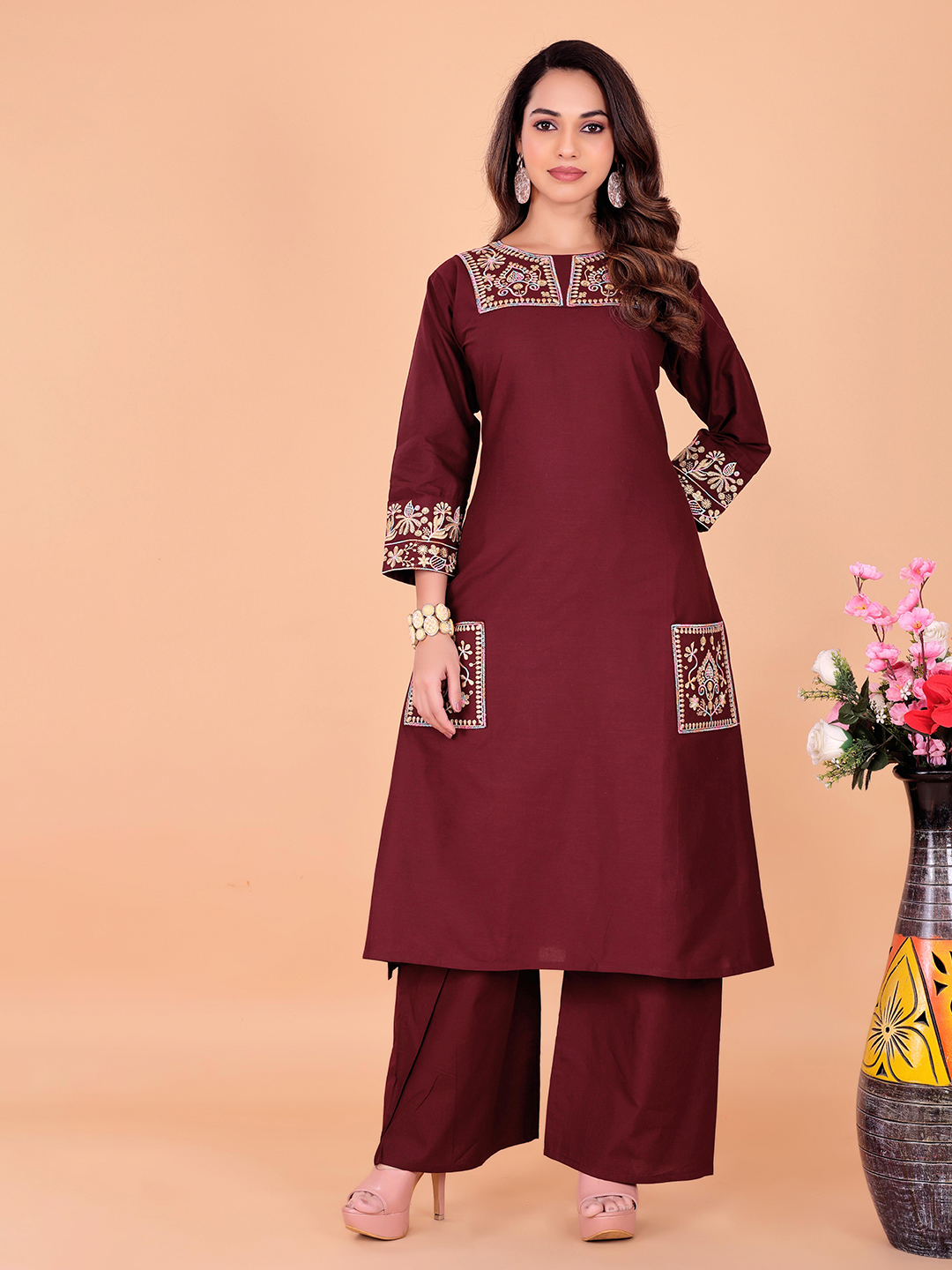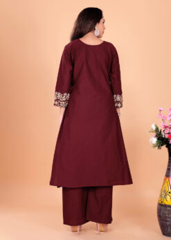 The Surili Maroon Dabu Cotton Embroidered Kurta Palazzo Set showcases traditional Indian craftsmanship combined with everyday comfort. Made from premium dabu printed cotton fabric, this set feels soft on the skin, offers excellent breathability, and remains comfortable for long hours of wear.