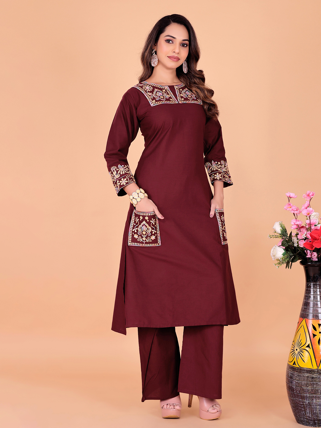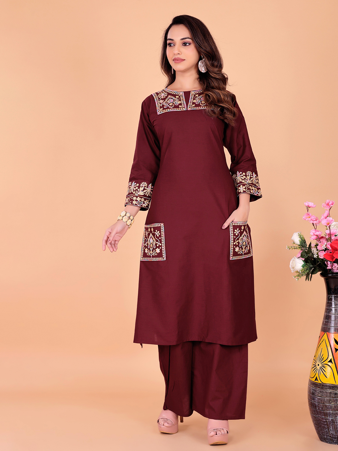The rich maroon color gives the set a sophisticated and timeless appeal, while the classic dabu print adds a handcrafted ethnic touch. Subtle embroidery on the kurta enhances the overall design without overpowering it. The kurta features a comfortable fit that flatters all body types and is paired with a matching palazzo that allows easy movement and relaxed wear. The natural cotton fabric keeps you cool and comfortable throughout the day.