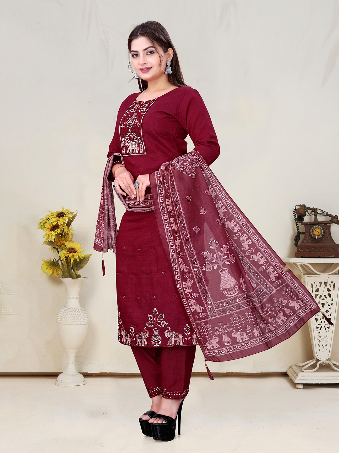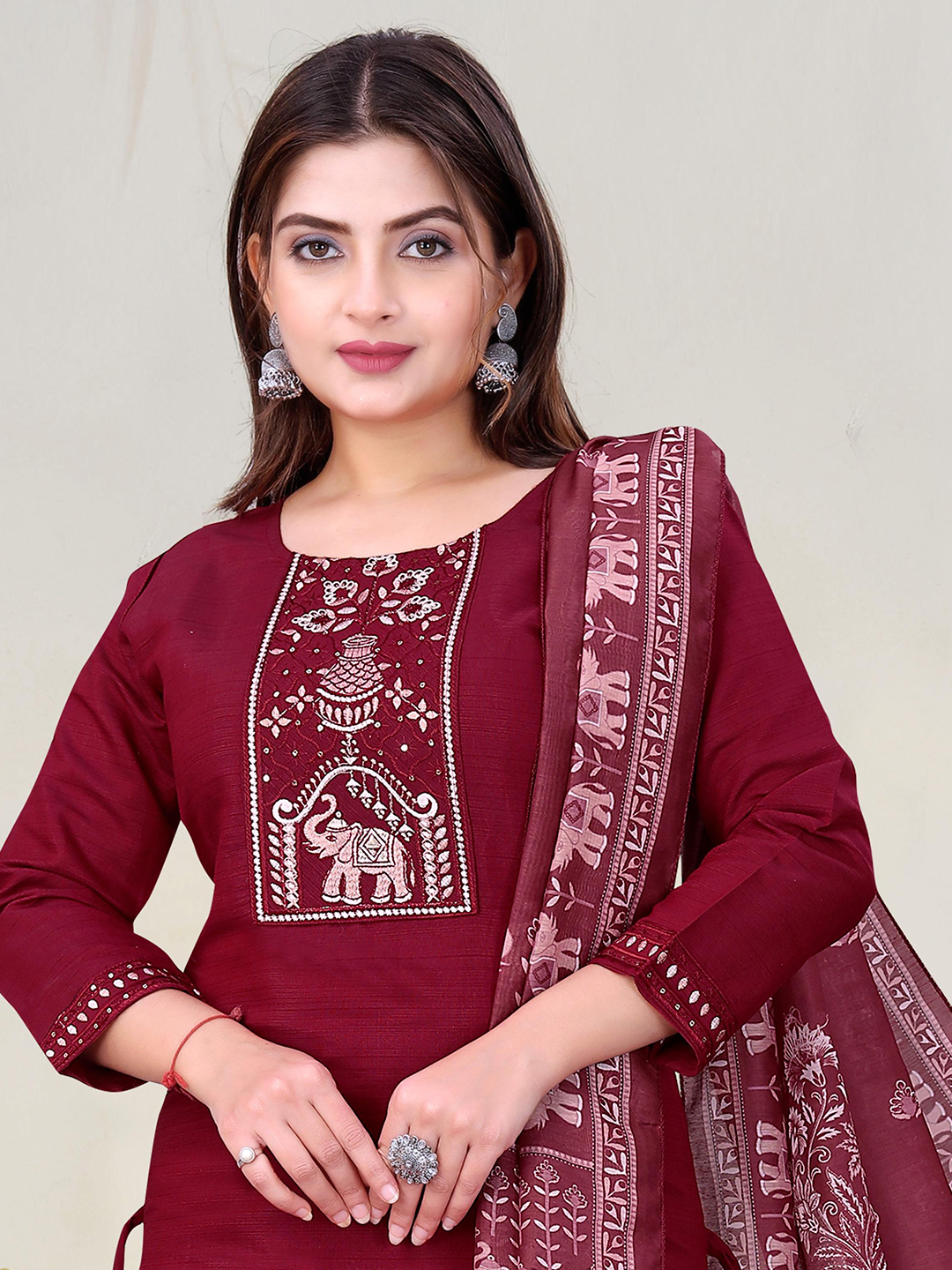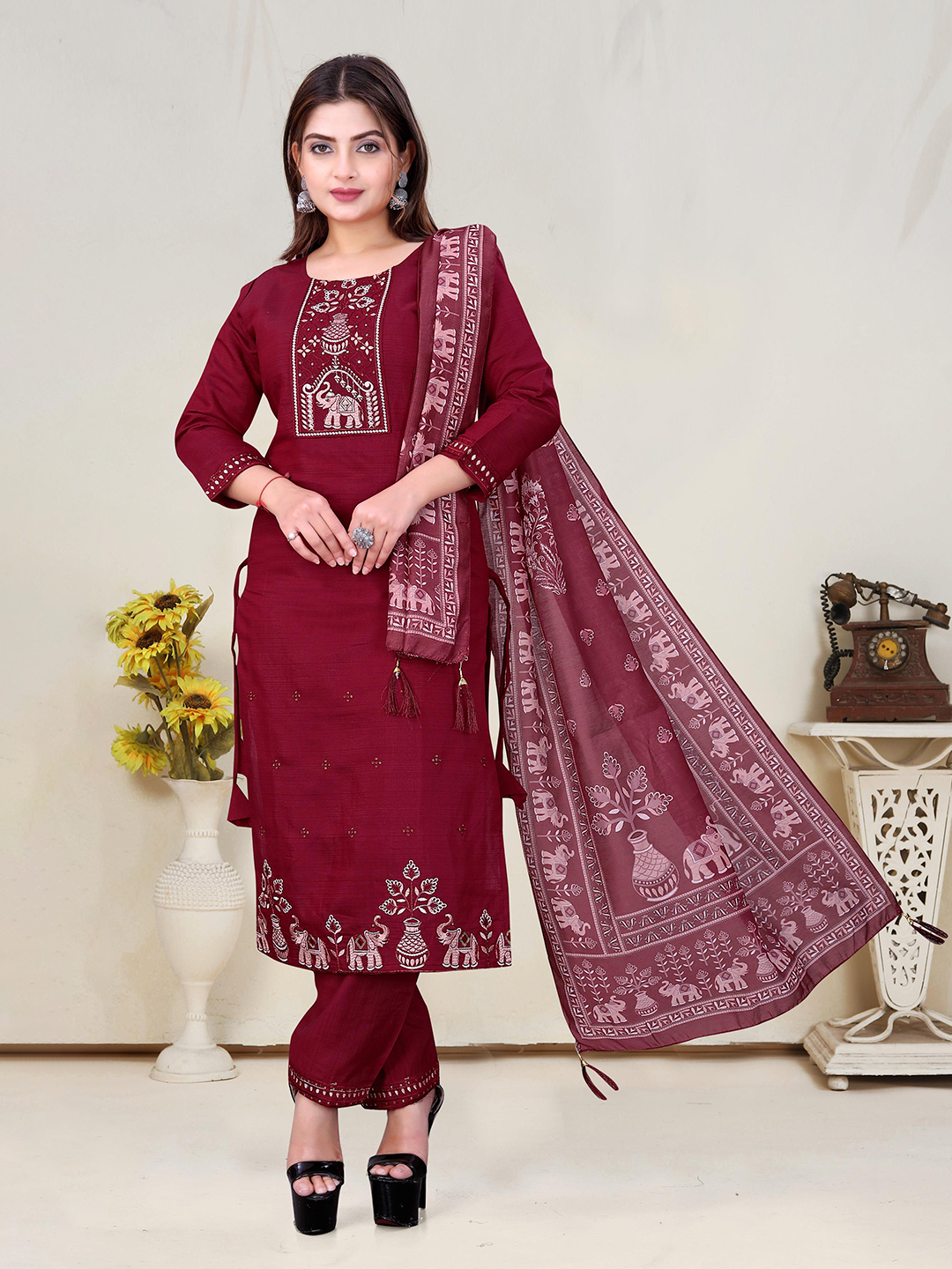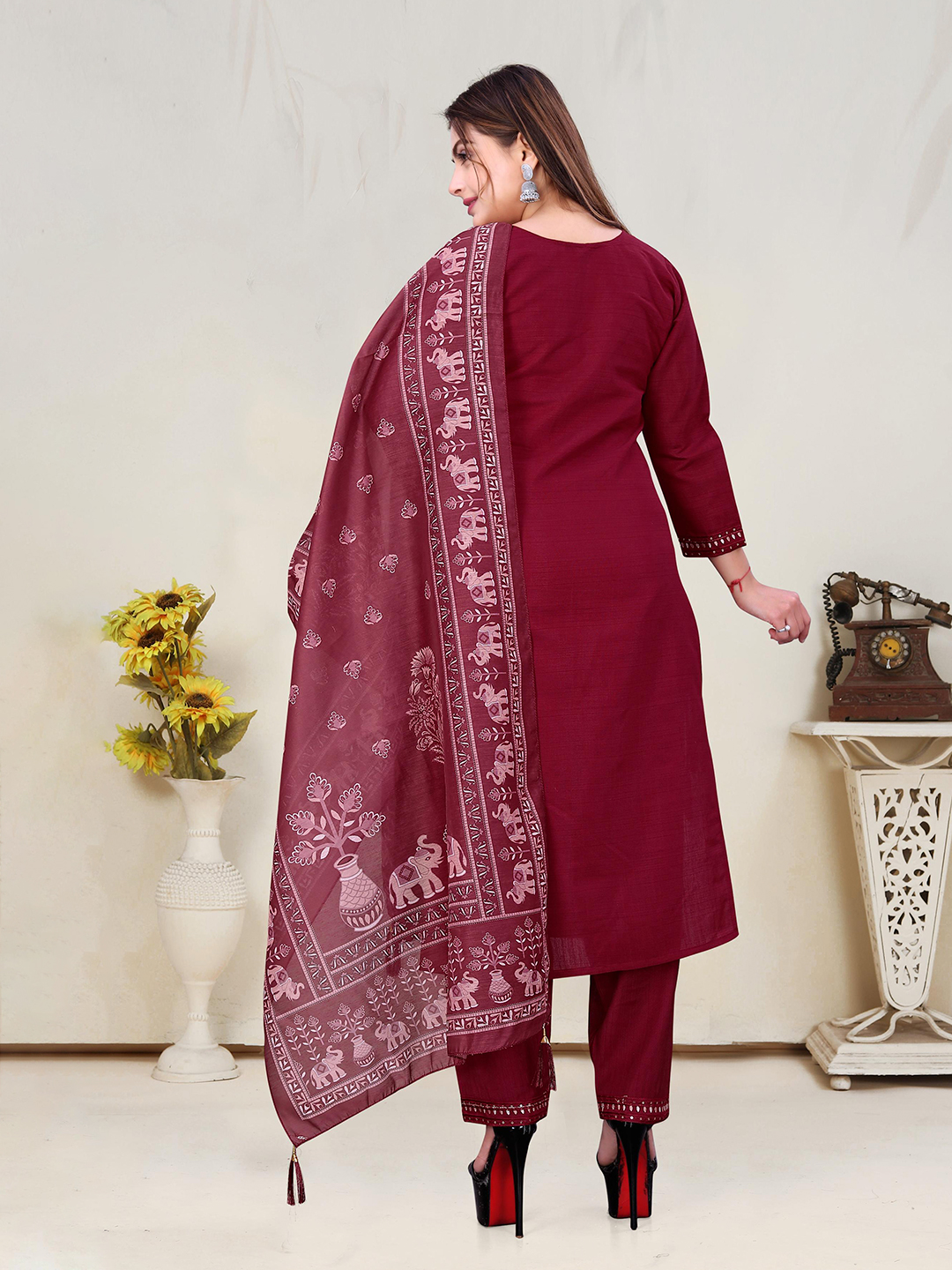 Surili Maroon Vatican Cotton Embroidery Kurta, designed for women who value comfort and classic style. Crafted from premium Vatican cotton fabric, this kurta offers excellent softness, breathability, and durability, making it ideal for all day wear.The rich maroon color gives the kurta a graceful and sophisticated look, while the delicate embroidery work on the front adds traditional charm. The straight fit silhouette provides a flattering appearance for all body types and ensures ease of movement. The lightweight cotton fabric keeps you comfortable in every season, especially during summer and humid weather.This kurta is perfect for office wear, daily wear, casual outings, festive occasions, and small family functions. It pairs effortlessly with leggings, palazzos, pants, or churidars, allowing you to style it in multiple ways. Designed with quality stitching and fine finishing, this kurta reflects Surili’s commitment to modern ethnic fashion.