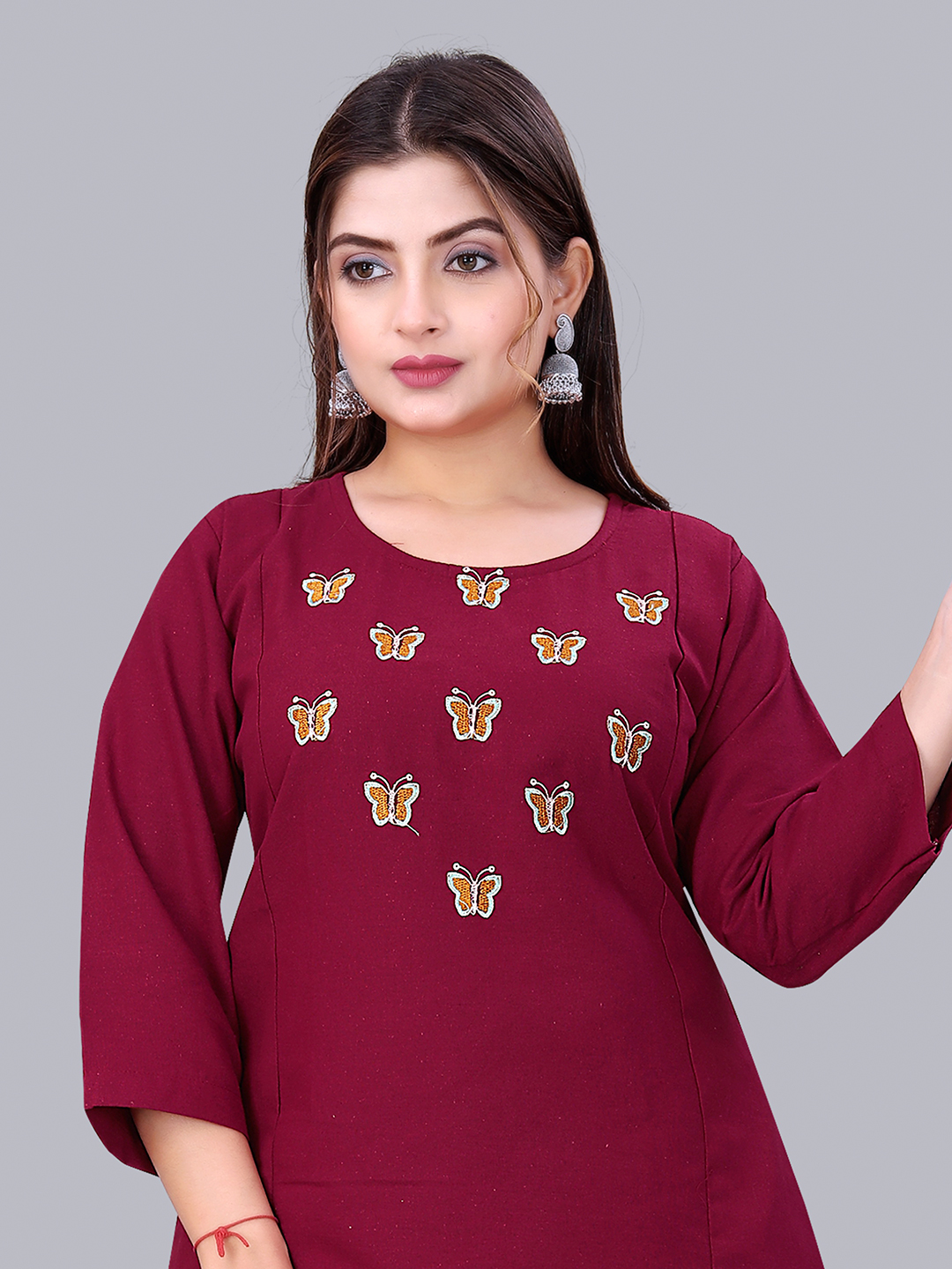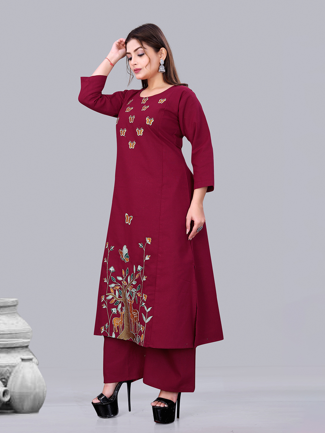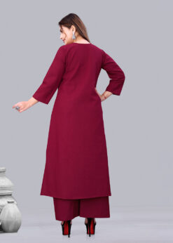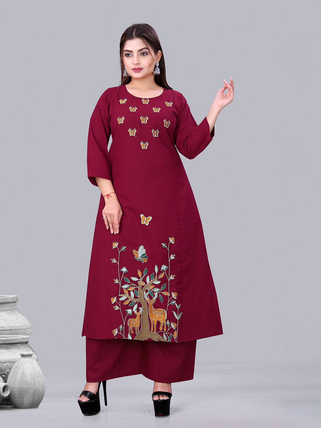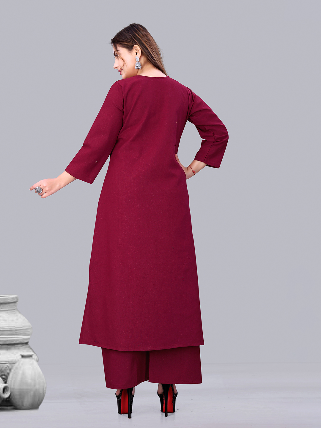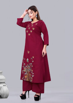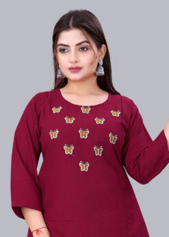 Surili Maroon Flax Cotton Embroidery Kurta, designed for women who love comfort with a touch of tradition. Crafted from breathable flax cotton fabric, this kurta offers a soft texture and lightweight feel, making it suitable for all-day wear.The rich maroon color enhances its ethnic appeal, while the delicate embroidery work adds graceful detailing without being overpowering. Tailored in a classic straight silhouette, this kurta pairs beautifully with leggings, palazzos, or pants, making it a versatile choice for daily wear, office use, casual outings, festive gatherings, and small celebrations.Easy to maintain and comfortable in every season, this embroidered flax cotton kurta is a perfect blend of style, simplicity, and traditional charm—an essential addition to every modern woman’s collection.