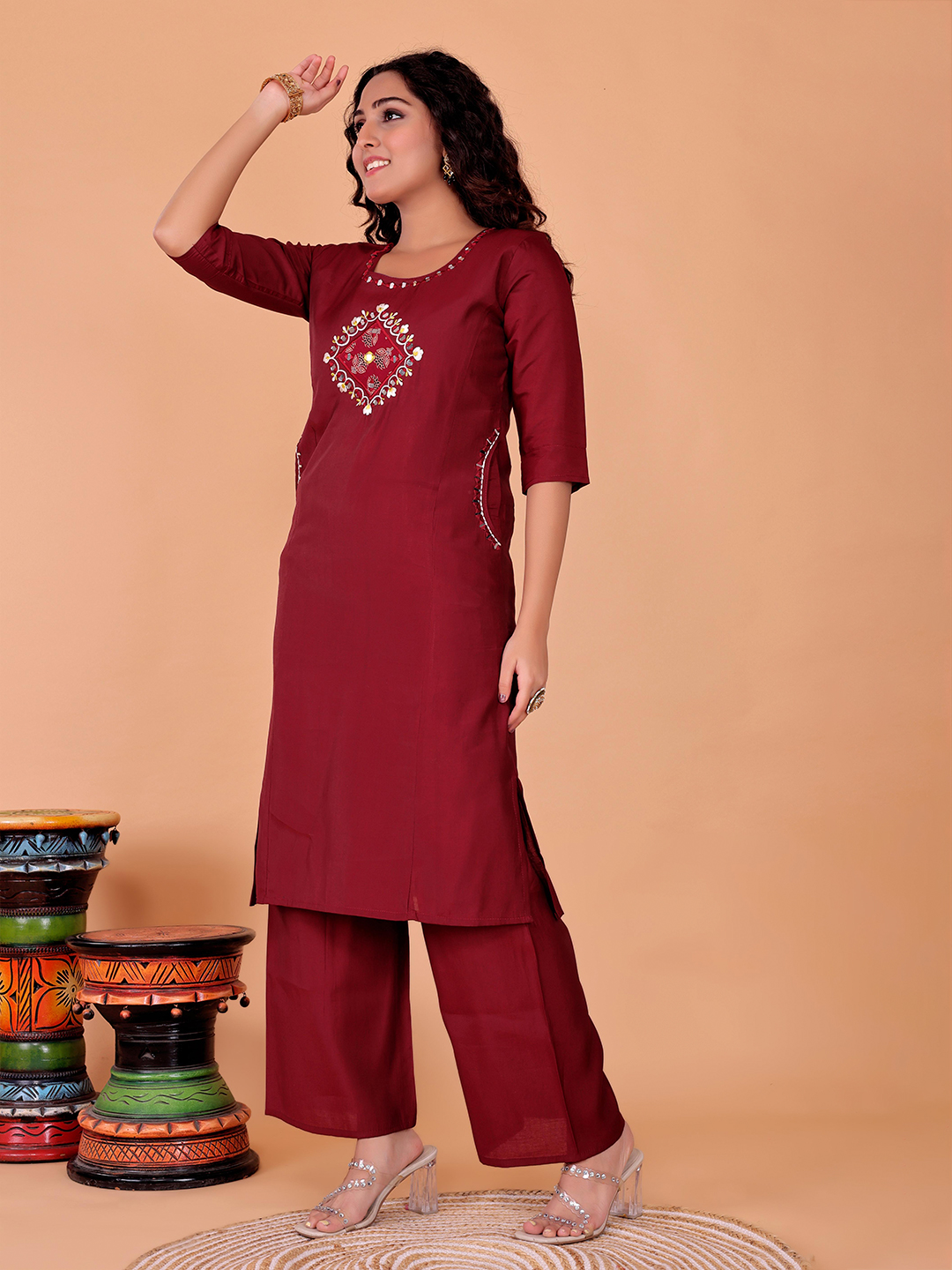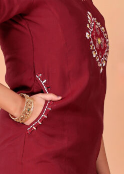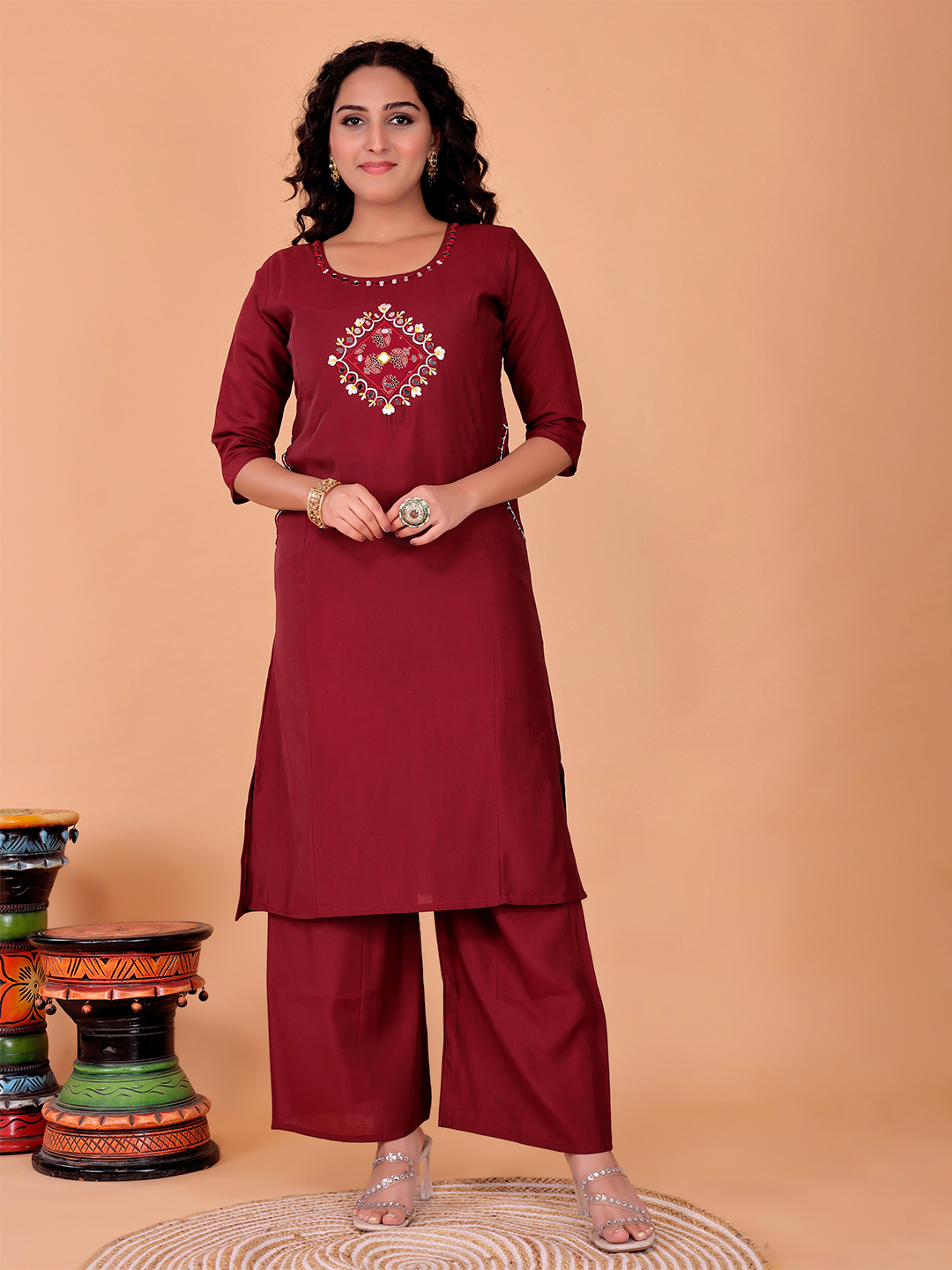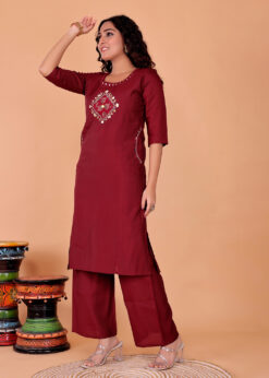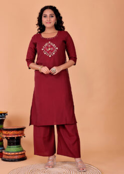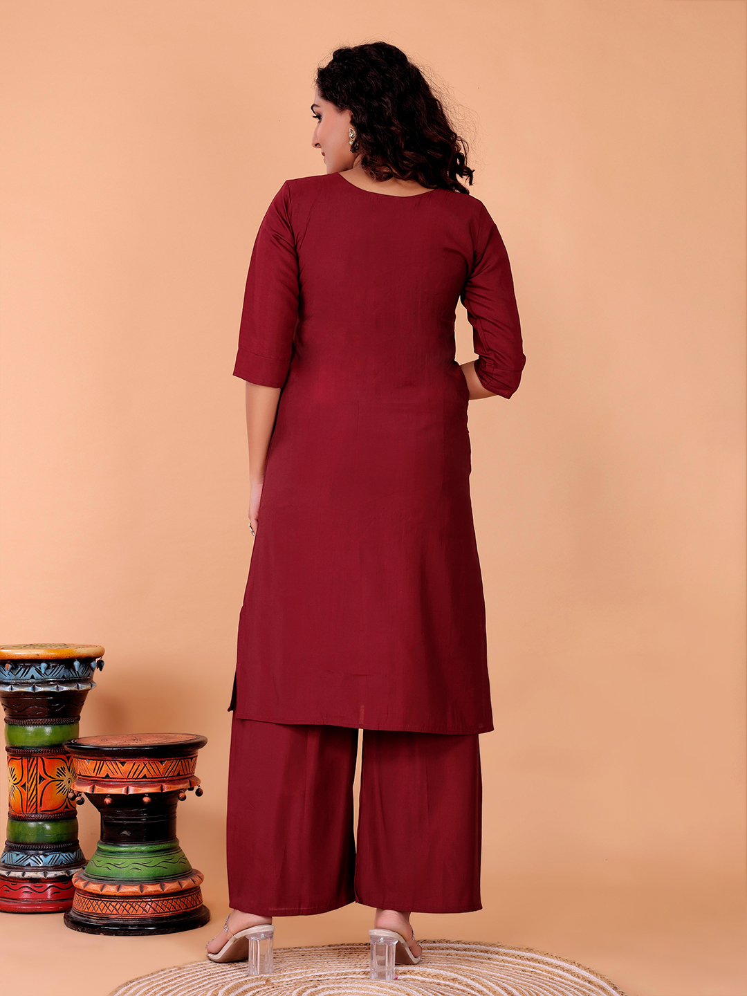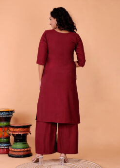 Surili Women’s Maroon Roman Cotton Embroidery Kurta Palazzo Set